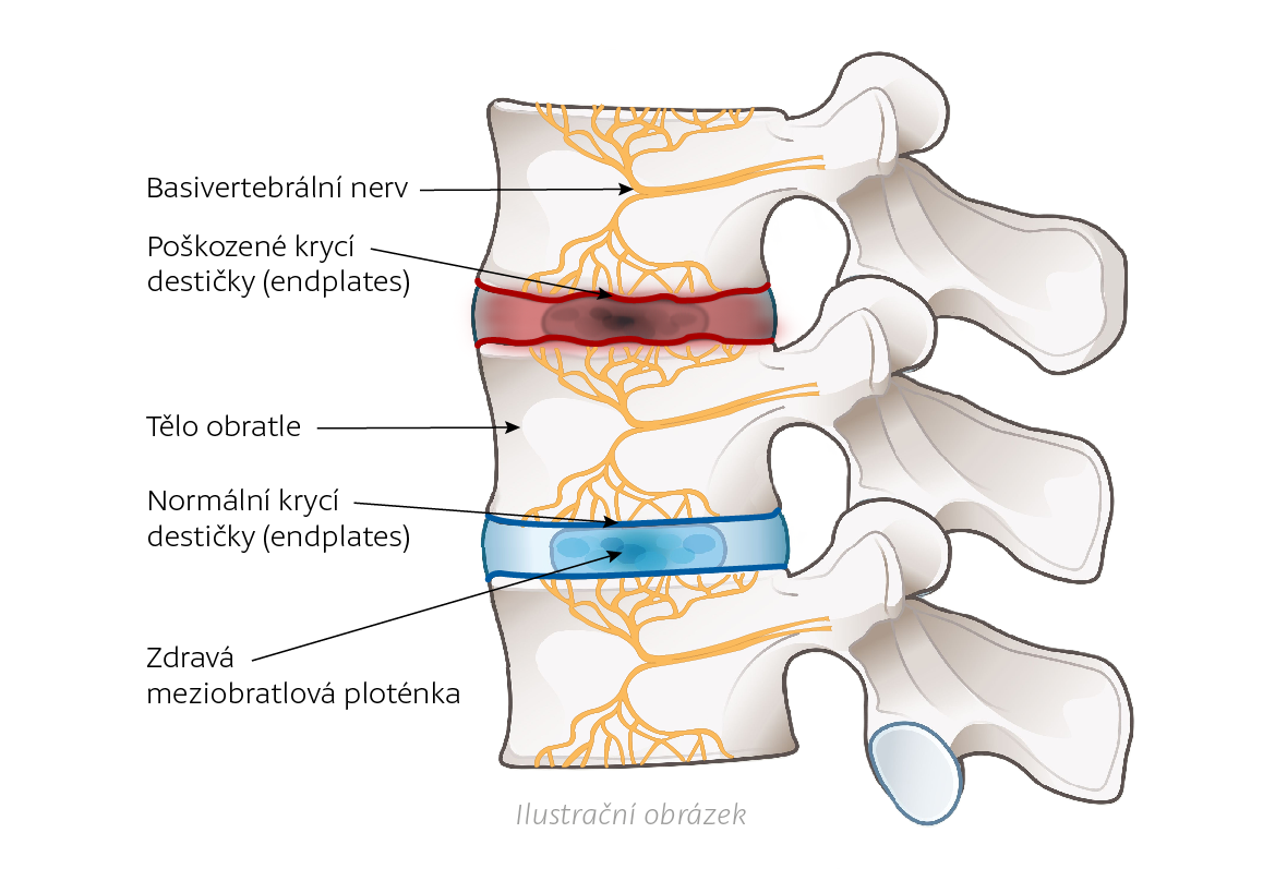 Bolest z této oblasti je vedena několika cestami. U většiny lidí převládá nervové zásobení (tzv. inervace) prostřednictvím sinuvertebrálních nervů, což jsou větve odstupující přímo z nervových kořenů. Tyto větve se dále spojují v basivertebrální nerv (BVN), který vstupuje do obratlového těla, kde se následně větví ke krycím destičkám obratlových těl (tzv. endplates).