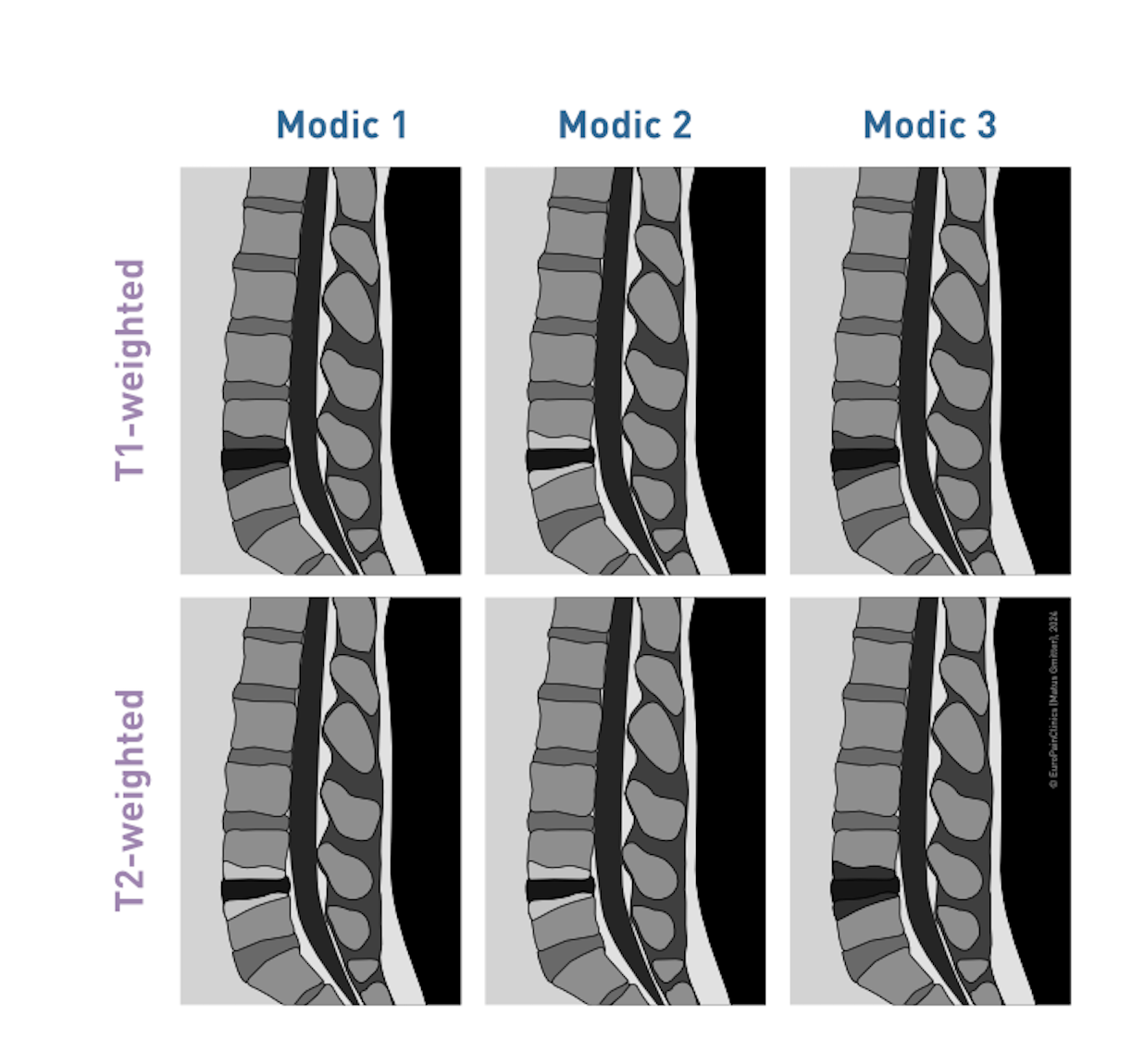 S výskytem axiální bolesti zad vzájemně souvisejí změny sousedních obratlů ploténky, které se označují jako tzv. Modic změny. Tyto změny jsou viditelné na magnetické rezonanci a doprovází je vznik otoku nebo zánětu v oblasti krycích destiček těl obratlů – endplates. Dělí se do tří typů. S axiální bolestí jsou nejčastěji spojeny změny typu Modic I a II.