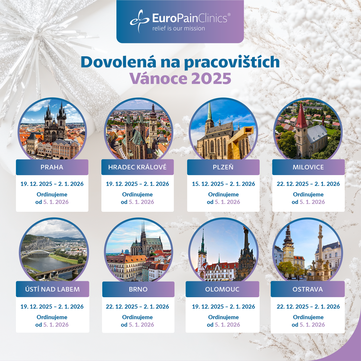 Vážení pacienti, dovolujeme si vás informovat o dočasném omezení provozní doby na našich pracovištích EuroPainClinics během letošních vánočních svátků z důvodu dovolených. V případě zájmu o objednání můžete kdykoliv využít ...