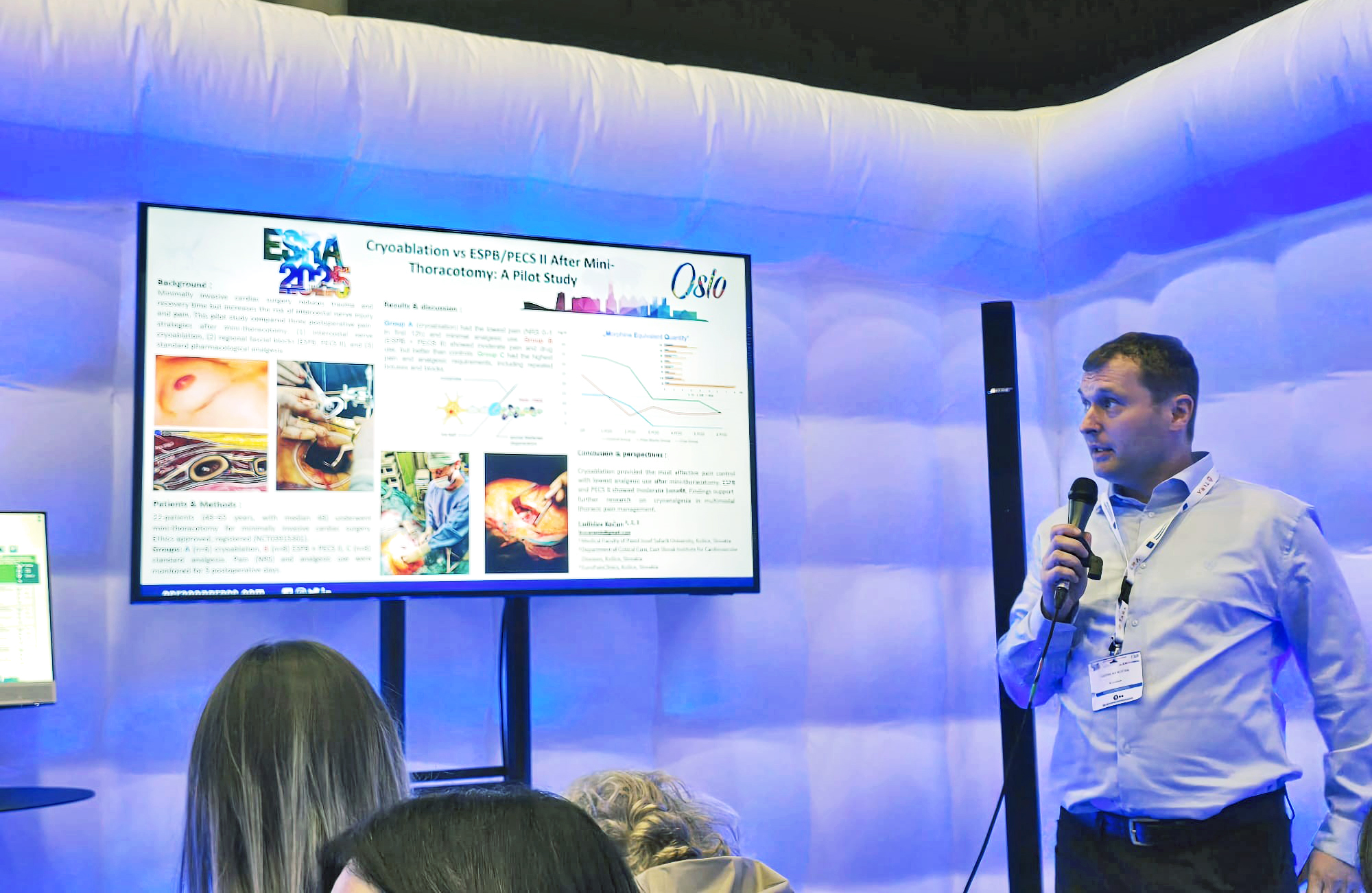 Doc. Kočan na konferenci představil odborný poster, na němž prezentoval výsledky probíhající klinické studie s názvem: Cryoablation vs. ESPB/PECS II After Mini-Thoracotomy: A Pilot Study“. Studie, realizovaná s podporou EuroPainClinics, se zaměřuje na srovnání účinnosti kryoablace a regionálních blokád (ESPB/PECS II) v rámci managementu pooperační bolesti po minitorakotomii. Předběžné výsledky přinášejí zajímavé poznatky pro klinickou praxi a mohou významně přispět k rozšíření terapeutických možností v oblasti akutní pooperační bolesti.