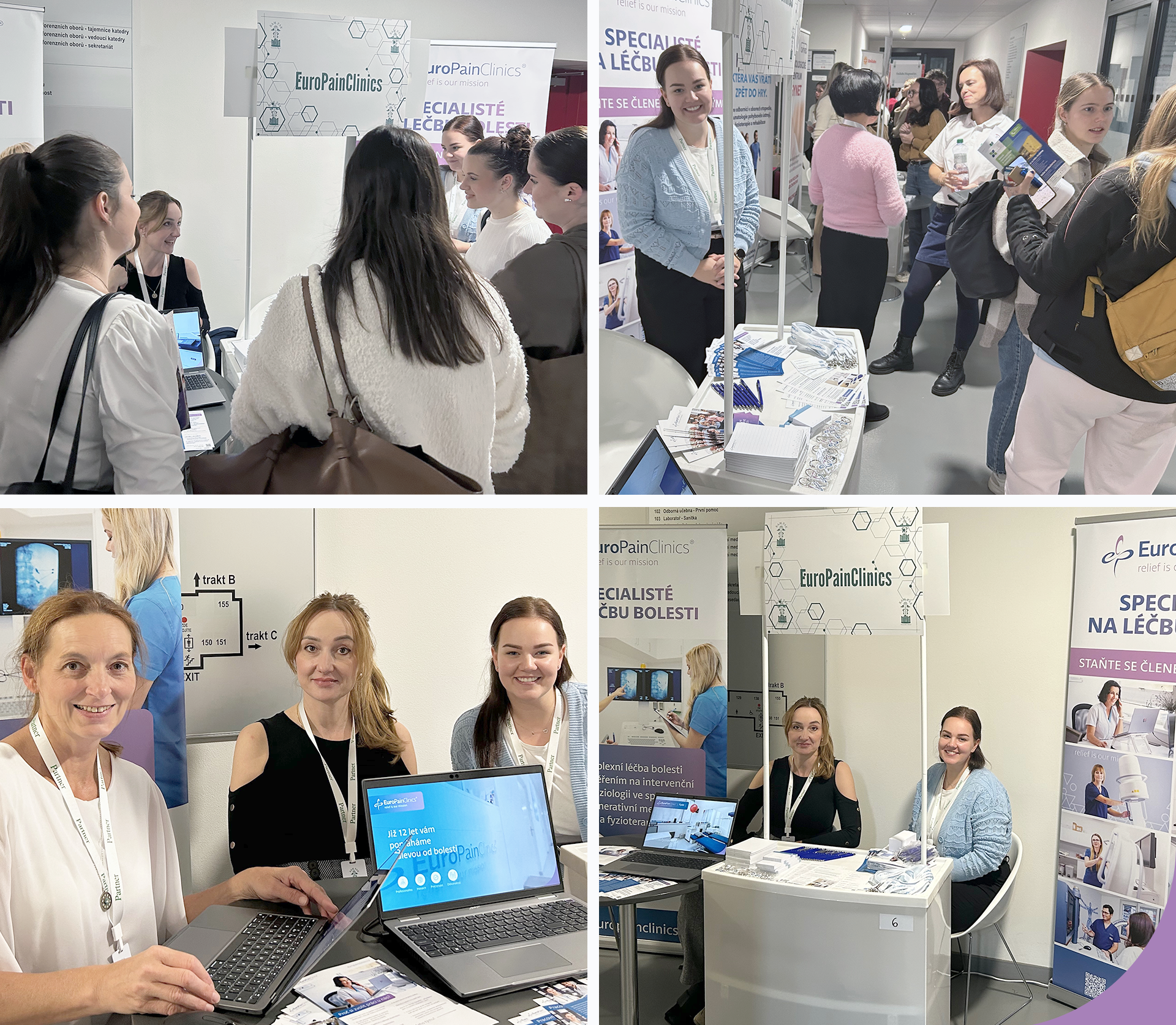 Budoucím lékařům, sestrám, radiologickým asistentům, ale i studentům a absolventům dalších zdravotnických oborů jsme představili specializaci intervenční algeziologie neboli intervenční léčby bolesti, spektrum výkonů při léčbě bolesti zad a kloubů i proces léčby pacientů v EuroPainClinics. V rámci naší prezentace, která byla zaštítěna Mgr. Zuzanou Korandovou, HR manažerkou EuroPainClinics, jsme zároveň přiblížili možnosti odborné spolupráce a profesního uplatnění pro ty, kteří by v budoucnu pro svoji profesní dráhu zvažovali práci v této oblasti či přímo na našich pracovištích.