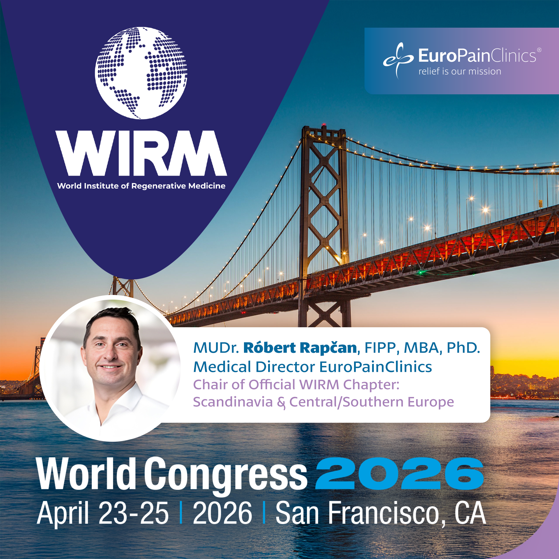 MUDr. Róbert Rapčan, FIPP, MBA, PhD., medicínský ředitel EuroPainClinics, se zúčastní prestižního kongresu Světové organizace regenerativní medicíny (World Institute of Regenerative Medicine, WIRM), který se uskuteční ve dnech 23.–25. dubna v San Franciscu.
